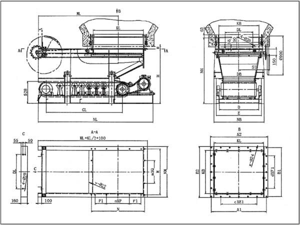 防砸閥門(mén)帶式(甲帶)給料機(jī)的外形及連接尺寸: